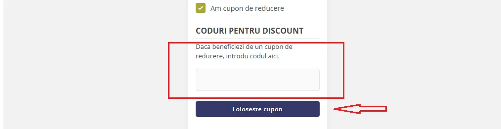 Dupa ce introduci codul in campul dedicat din cosul de cumparaturi, sistemul va recalcula automat pretul total si va afisa reducerea aplicata. Daca suma ramane neschimbata, inseamna ca voucherul nu este valabil pentru produsele selectate.