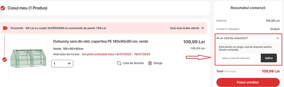 Reducerea se aplica instant, iar suma finala se actualizeaza automat. Important de retinut: unele coduri sunt valabile doar pentru comenzi peste o anumita valoare, pentru anumite categorii sau in perioade limitate. Verifica intotdeauna conditiile codului ca sa fii sigur ca profiti la maxim de oferta.