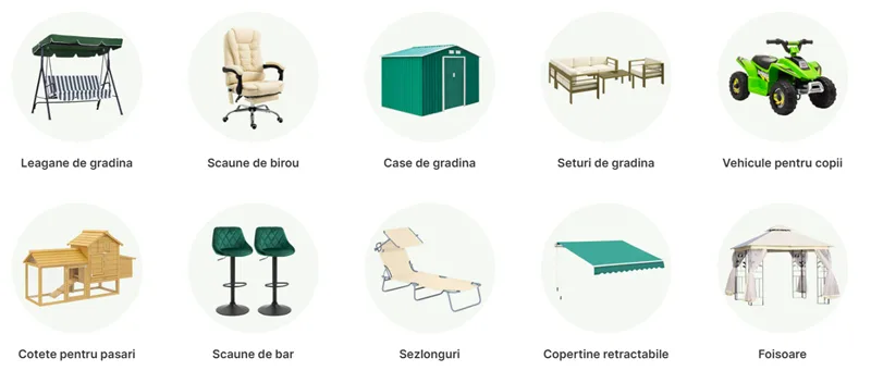 Pentru cei care lucreaza de acasa, Aosom ofera birouri functionale, scaune ergonomice si solutii de organizare adaptate stilului tau de lucru. Daca esti pasionat de gradinarit, ai la dispozitie sere, cutii de unelte, balansoare si mobilier de exterior. Iar pentru animalele de companie – ansambluri pentru pisici, custi, garduri si accesorii create special pentru confortul lor.