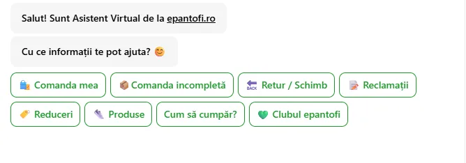 Daca ai intrebari, probleme cu comanda sau vrei sa faci retur, ai la dispozitie mai multe metode de contact. Echipa de suport Epantofi iti sta la dispozitie pentru orice intrebare legata de comanda, retururi, marimi sau probleme intampinate in procesul de plata.